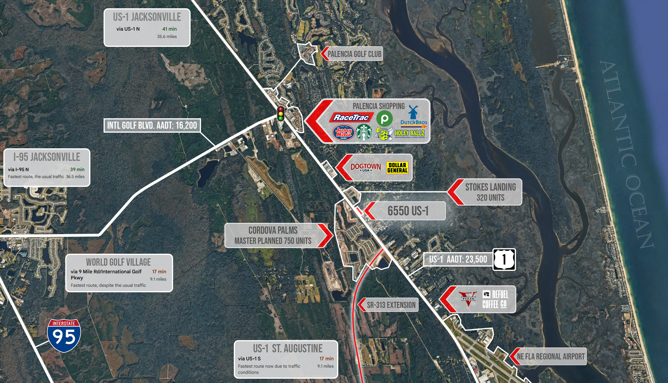 This stretch of US-1 continues to see increasing commercial activity, driven by population growth and tourism in St. Augustine. Easy access to major roadways ensures seamless connectivity to surrounding areas, including downtown and Interstate 95.